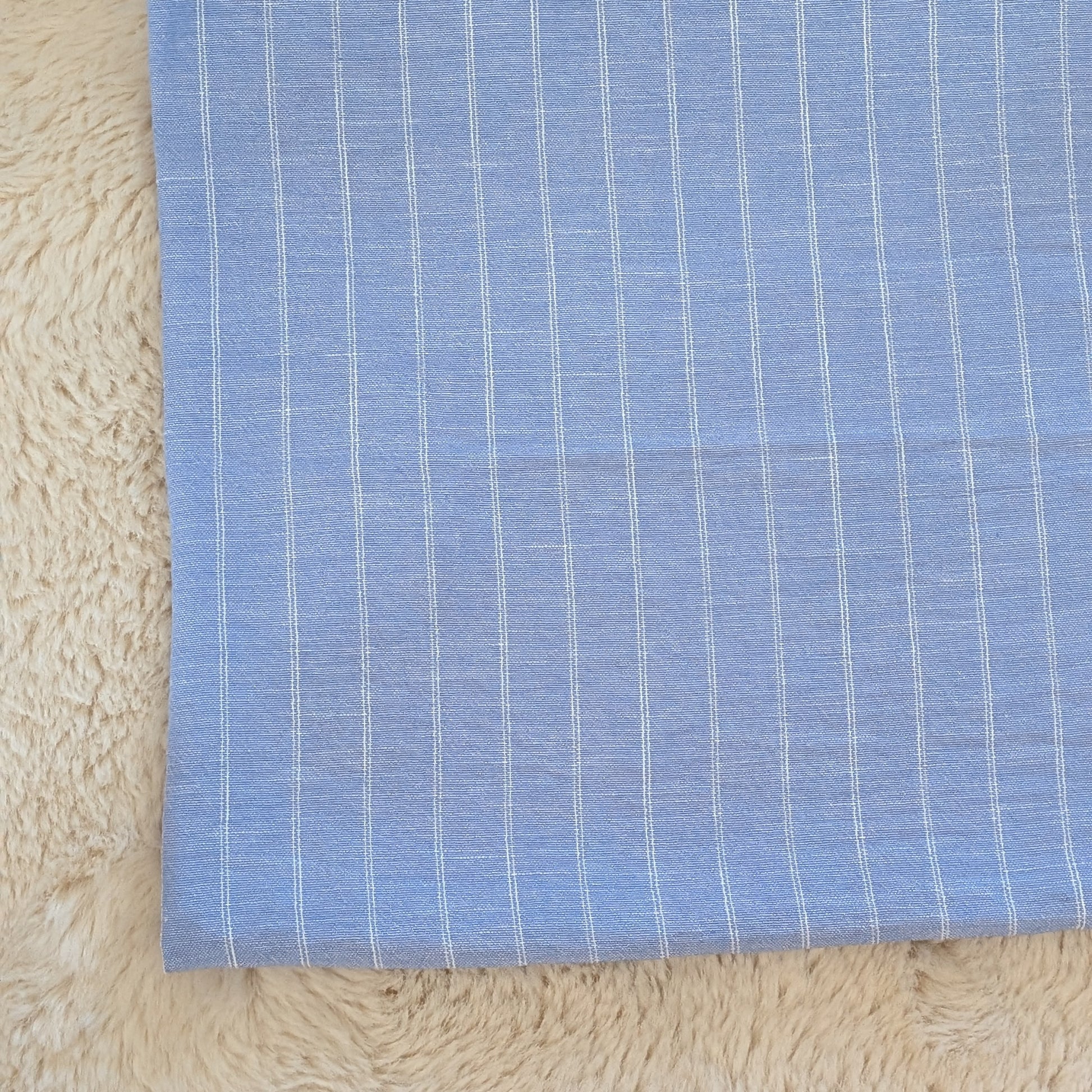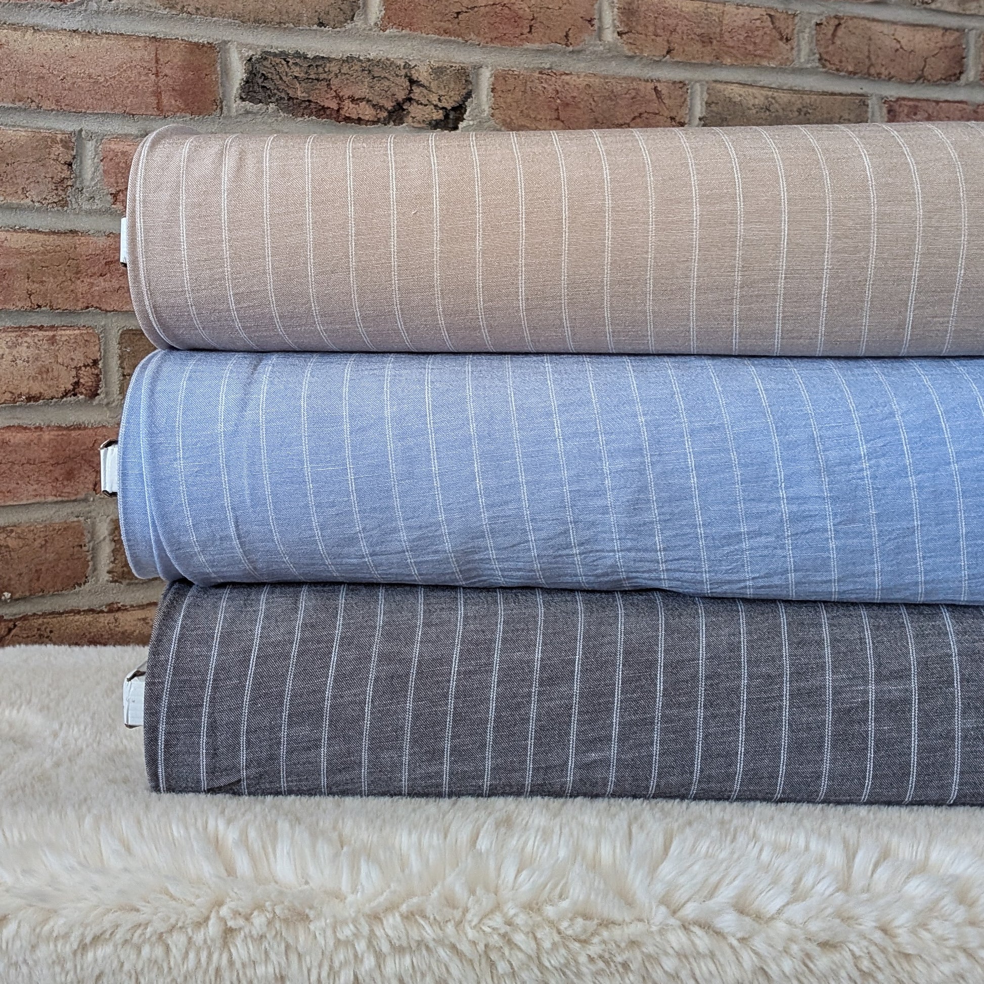 Double white stripes on a poly fabric that is designed to imitate the look of a linen fabric. 100% linen-look poly. Available in three colors. By the half yard.